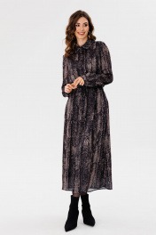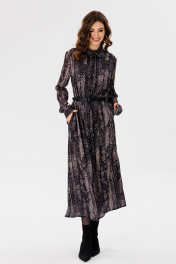 Платье выполнено из креп-атласа с принтом. Платье рубашечного силуэта, длиной миди. Застежка спереди на пуговицы. На спинке кокетка и встречная складка от нее. Воротник стояче-отложной с отрезной стойкой. Рукав втачной, одношовный, с прорезью по низу. Низ рукава на манжете, застегивающейся на пуговицы. В боковых швах карманы. Платье декорировано нашивками по спинке. Платье на отлетной по низу подкладке. Длина платья: р. 42-46 - 130 см, р. 48-52 - 132 см. длина рукава: р. 42-46 - 64 см, р. 48-52 - 65 см. Гарантийный срок не установлен ГОСТ 25294-2003 42 44 46 48 50 52 Длина по центру спинки 130 130 130 132 132 132 Длина рукава 64 64 64 65 65 65 Объем по груди 100 104 108 112 116 120 Объем по талии 106 110 114 118 122 126 Объем по бедрам 120 124 128 132 136 140 Объем по низу 156 160 164 168 172 180 Объем рукава вверху 34 36 38 38 40 42
