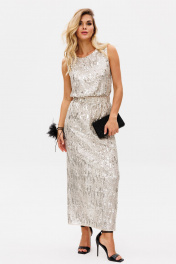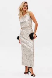 Юбка выполнена из трикотажного полотна с пайетками. Юбка прямого силуэта, длиной миди. Сзади в среднем шве шлица. Юбка на отлетной по низу подкладке. Длина юбки: р. 42-46 - 94 см, р. 48-52 - 95 см.