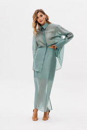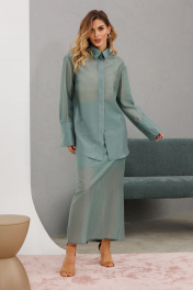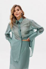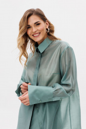 Блузка выполнена из плательно-блузочной ткани. Блузка прямого силуэта, длиной ниже линии бедер. Спереди застежка на пуговицы и потайную планку. Спинка цельная. Воротник стояче-отложной. Плечевой шов удлинен. Рукав рубашечного покроя, одношовный. Низ рукава на притачной манжете. Низ блузки фигурной формы. Длина блузки: р. 44-48 - 78 см, р. 50-54 - 79,5 см. 44 46 48 50 52 54 Длина по центру спинки 78 78 78 79,5 79,5 79,5 Длина рукава от горловины78 78 78 79,5 79,5 79,5 Объем по груди 112 116 120 124 128 132 Объем по талии 112 116 120 124 128 132 Объем по низу 114 118 122 126 130 134 Объем рукава вверху 37 39 41 41 43 45 Объем рукава внизу 27 27 27 28,5 28,5 28,5