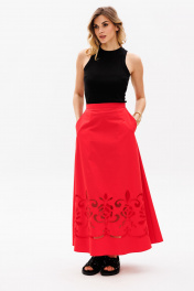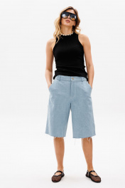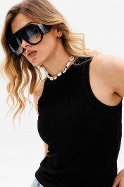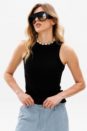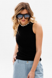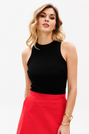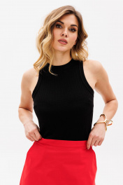 Джемпер выполнен из трикотажного полотна в рубчик. Джемпер приталенного силуэта, длиной выше линии бедер. Перед и спинка цельные. Горловина округлой формы. Плечевой шов заужен. Горловина и пройма обработаны бейками из основной ткани. Длина джемпера: р. 42-46 - 56 см, р. 48-54 - 58.