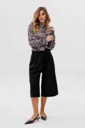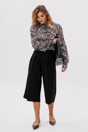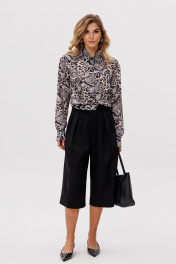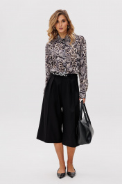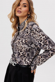 Блузка выполнена из ткани креп-шифон с анималистичным принтом. Спереди центральная застежка на потайную планку с пуговицами. Спинка цельная. Воротник стояче-отложной. Плечевой шов удлинен. Рукав рубашечный одношовный. Низ рукава на притачной манжете. Длина блузки: р. 44-48 - 73 см, р. 50-54 - 74,5 см. 44 46 48 50 52 54 Длина по центру спинки 73 73 73 74,5 74,5 74,5 Длина рукава от горловины 78 78 78 79,5 79,5 79,5 Объем по груди 112 116 120 124 128 132 Объем по талии 112 116 120 124 128 132 Объем по низу 114 118 122 126 130 134 Объем рукава вверху 36 38 40 40 42 44 Объем рукава внизу 21 21 21 21 21 21
