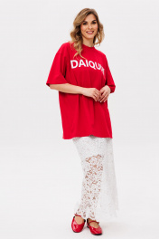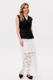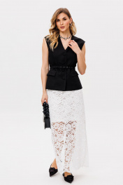 Юбка выполнена из гипюра с напыление серебристого цвета. Юбка прямого силуэта длиной миди, на притачном поясе. На заднем полотнище в среднем шве застежка на потайную молнию. Пояс застегивается на петлю и пуговицу. По низу юбки фестоны. Юбка на короткой отлетной по низу подкладке. Длина юбки: р. 44-48 - 94 см, р. 50-54 - 95см.