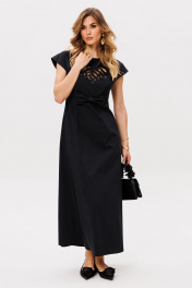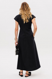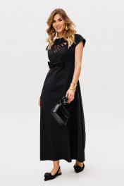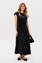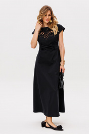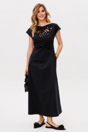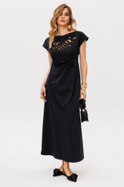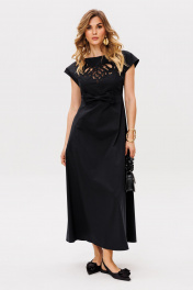 Платье выполнено из платель-блузочной ткани. Платье полуприлегающего силуэта, длиной миди. Перед декорирован вышивкой. В среднем шве спинки застежка на потайную молнию. Горловина формы "лодочка". Плечевой шов удлинен. Рукав цельнокроенного покроя. Юбка расширена к низу. В боковых швах карманы. Перед декорирован бантом. Длина платья: р. 44-48 - 131,5 см, р. 50-54 - 133 см. Длина рукава от горловины: р. 44-48 - 12 см, р. 50-54 - 13 см. Гарантийный срок не установлен ГОСТ 25294-2003