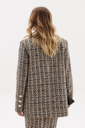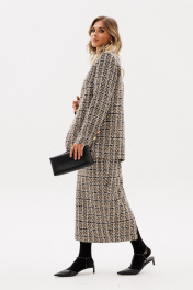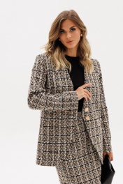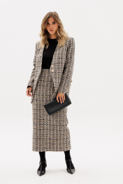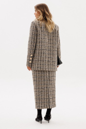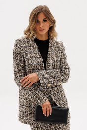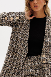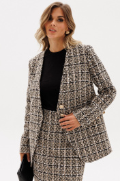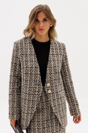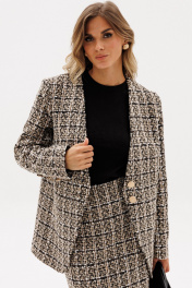 Жакет выполнен из твида. Жакет прямого силуэта, длиной до линии бедер. Спереди центральная застежка на пуговицы. Край борта фигурной формы. На спинке средний шов. Горловина V-образной формы. Рукав втачной двухшовный с декоративными пуговицами. Жакет на притачной по низу подкладке. Длина жакета: р. 44-48 - 74 см, р. 50-54 - 75,5 см. Длина рукава: р. 44-48 - 63 см, р. 50-54 - 64 см. 44 46 48 50 52 54 Длина по центру спинки 74 74 74 75,5 75,5 75,5 Длина рукава 63 63 63 64 64 64 Объем по груди 102 106 110 114 118 122 Объем по талии 100 104 108 112 116 120 Объем по низу 106 110 114 118 122 126 Объем рукава вверху 34 36 38 38 40 42 Объем рукава внизу 26 26 26 28 28 28