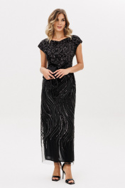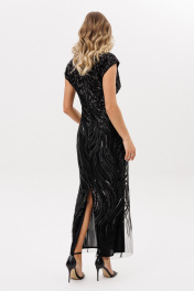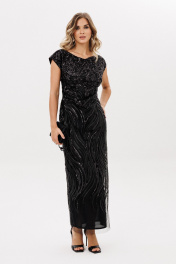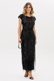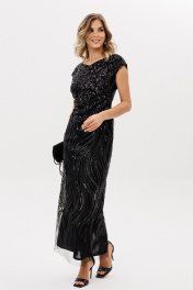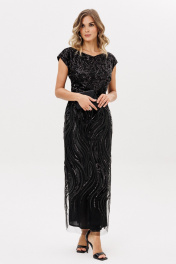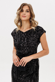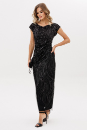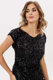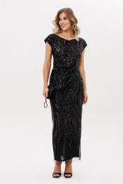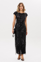 Платье выполнено из сетки с вышивкой с пайетками. В среднем шве спинки разрез и застежка на молнию с металлическими звеньями. Горловина и спинка выполнены в виде V-образной лодочки. Плечевой шов удлинен, образуя рукав цельнокроенного покроя. Платье на отлетной по низу подкладке. Длина платья: 134 см. 44 46 48 Длина по центру спинки 134 134 134 Длина рукава 12,5 12,5 12,5 Объем по груди 92 96 100 Объем по талии 78 82 86 Объем по бедрам 96 100 104 Объем по низу 94 98 102