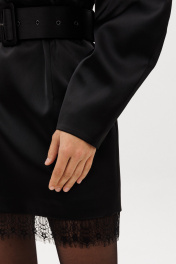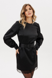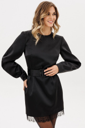 Платье выполнено из плотного атласа. Платье полуприлегающего силуэта длиной выше линии колена. Застежка на потайную молнию сзади в среднем шве спинки. Горловина округлой формы. Рукав двухшовный, фигурной формы. Низ платья декорирован кружевом. Платье на притачной по низу подкладке. В комплект входит съемный ремень из основной ткани с обтяжной пряжкой и блочками. Длина платья по центру спинки - 86 см. Длина рукава - 63 см. 44 46 48 Длина по центру спинки 86 86 86 Длина рукава 63 63 63 Объем по груди 96 100 104 Объем по талии 80 84 88 Объем по бедрам 100 104 108 Объем по низу 98 102 106 Объем рукава вверху 37 39 41 Объем рукава внизу 22 22 22