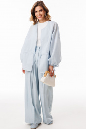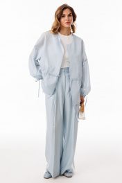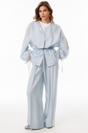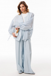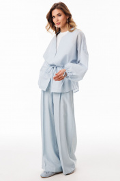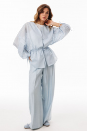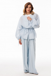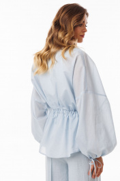 Блузка из выполнена из плательно-блузочной ткани в мелкую полоску. Блузка Х-образного силуэта, длиной до линии бедер. По переду обработана центральная застежка встык на две навесные петли и пуговицы. Спинка цельная. Горловина округлой формы. Плечевой шов удлинен. Рукав покроя кимоно, одношовный, расширенный и присборенный по низу с эластичной тесьмой. Низ рукава декорирован бантиком из основной ткани. Низ блузки фигурной формы. По линии талии обработана кулиса со шнуром из основной ткани. Длина блузки: р. 42-46 - 68,5 см, р. 48-52 - 70 см БЛУЗКА м. 3085 42 44 46 48 50 52 Длина по центру спинки 68,5 68,5 68,5 70 70 70 Длина рукава от горловины 74 74 74 75,5 75,5 75,5 Объем по груди Объем по талии 122 126 130 134 138 142 Объем по низу 128 132 136 140 144 148 Объем рукава вверху 51 53 55 55 57 59 Объем рукава внизу 22/40 22/40 22/40 23/43 23/43 23/43