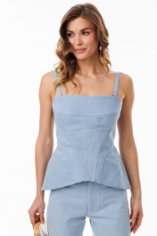 Топ выполнен из плотного джинса. Топ приталенного силуэта, выполнен в виде корсета. По переду обработаны горизонтальные, вертикальные и фигурные подрезы. На спинке обработаны вертикальные и фигурные подрезы и средний шов спинки с застежкой на молнию с металлическими звеньями. Обьем по бедрам увеличен. Топ на сьемных и регулируемых бретелях. Топ на притачной по низу подкладке. Длина топа по спинке: р. 42-46 - 39,5 см ТОП м. 3099 42 44 46 Длина по центру спинки 39,5 39,5 39,5 Объем по груди 84 84 84 Объем по талии 68 72 76