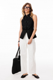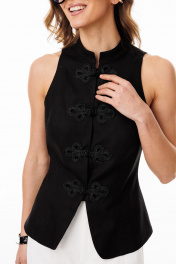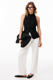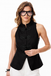 Жилет выполнен из плательно-блузочной ткани. Жилет приталенного силуэта, длиной выше линии бедер. По переду обработаны рельефы от проймы до низа, центральная застежка встык на кнопки с декоративными клевантами. Плечевой шов заужен. Горловина округлой формы, обработана воротником-стойкой. На спинке обработаны талиевые вытачки. Низ борта закругленной формы. Жилет на притачной по низу подкладке. Длина жилета по спинке: р.42-46 - 58,5 см. ЖИЛЕТ м. 3100 42 44 46 Длина по центру спинки 58,5 58,5 58,5 Объем по груди 91 95 99 Объем по талии 79 83 87 Объем по низу 104 108 112