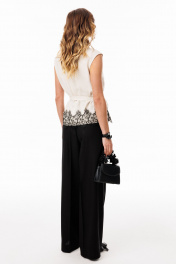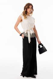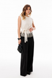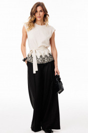 Брюки-палаццо выполнены из льна. Брюки на притачном поясе, длиной в пол, расширенные к низу. Спереди складки и боковые карманы с наклонным входом. Застежка спереди на молнию с гульфиком и пуговицу. На задних частях обработаны талиевые вытачки. Длина брюк: р. 42-46 - 116,5 см, р. 48-52 - 117,5 см БРЮКИ м. 3101 42 44 46 48 50 52 Длина сбоку с поясом 116,5 116,5 116,5 117,5 117,5 117,5 Объем по талии 68 72 76 80 84 88 Объем по бедрам 96 100 104 108 112 116 Ширина пояса 3,7 3,7 3,7 3,7 3,7 3,7