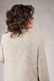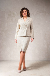Жакет женский, полуприлегающего силуэта. Воротник и лацкан пиджачного типа. Двухбортная застежка на петли и пуговицы. По переду рельефы идущие он плечегого шва и к низу жакета. Втачной рукав. Жакет выполнен на подкладке.
