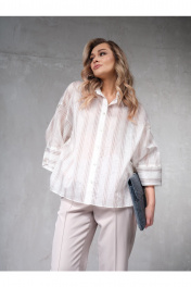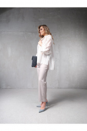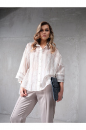 Блуза женская, прямого свободного силуэта. Рубашечный рукав, длинной ниже локтя с манжетой по низу без застежки. Воротник рубашечный на стойке. Застежка впереди на петли и пуговицы. Низ блузки разновеликий. По бокам выполнены разрезы.