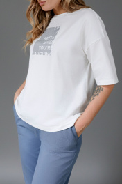 Футболка прямого силуэта – настоящий маст-хэв для тех, кто ценит комфорт и безупречный стиль. Выполненная из натуральных, невероятно приятных к телу материалов, она подарит вам ощущение свежести и легкости на весь день. Прямой крой и актуальный спущенный рукав обеспечивают идеальную посадку и создают расслабленный, но при этом шикарный вид.