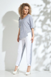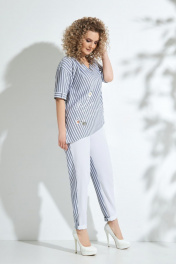 Костюм Женский выполнен из Льна-Вишера. Костюм состоит из Брюк и блузона. Брюки зауженные к низу на притачном поясе с резинкой. В боковых швах имеются функциональные карманы. Блузон с ассиметричной молнией по переду. Горловина - ассиметричная. Рукав – приспущенный с манжетам по низу. Спинка с кокеткой и складкой. Низ – ассиметричный.