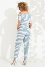 Костюм женский 2ка состоящий из блузона и брюк. Блузон ассиметричный с одним спущенным рукавом по переду изделия расположена планка с застежкой-кнопки. Рукав короткий. По переду и спинке для лучшего прилегания расположены выточки. Брюки с запашными элементами по переду, на притачном поясе с резинкой. В боковых швах брюк имеются функциональные карманы. застежка- потайная молния. низ брюк с манжетами по низу.