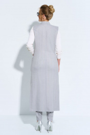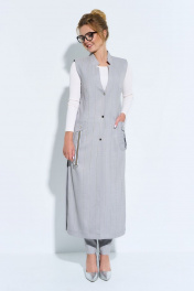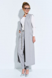 Женский брючный костюм двойка, состоящий из жилета и брюк. Жилет удлиненный, без подкладки. Горловина изделия воротник-стойка. Частичная застежка на пуговицы в области груди. Имеются нагрудные вытачки, обеспечивая комфортное прилегание. В области талии выполнены накладные карманы с декоративным элементом. В боковых швах по низу изделия разрезы, дополненные лентой. По спинке кокетка, средний шов и талевые вытачки. Брюки классические, комфортной посадки, зауженные к низу. Пояс - кокетка-обтачка со шлевками-кулисами, под декоративный ремень из репсовой ленты. Застежка на две пуговицы и молнию. В боковых швах брюк выполнены функциональные карманы. По задней половине брюк выполнена кокетка. Длина жилета по спинке – 116 см. Длина брюк по боковому шву - 96 см