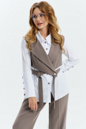 Костюм женский 3х предметный состоит тз брюк блузы и жилета, блуза выполнена из хлопковой ткани, полуприлегающего кроя , горловина воротник на стойке, рукав втачной с высокой манжетой по низу рукава, застежка - планка с петлей пуговицей, низ фигурный. Жилет свободного кроя, укороченный, воротник отложной с лацканами, по переду жилета съёмный пояс, с застежкой петли -пуговицы. Брюки средней посадки, прямого кроя на притачном поясе с резинкой, в боковых швах имеются карманы, застежка петля- пуговица и молния на гульфике