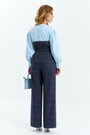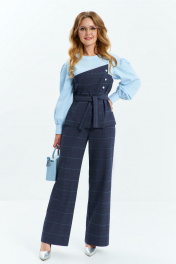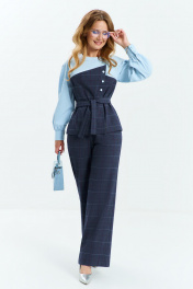Костюм женский двухпредметный выполнен из сочетания хлопковой и костюмной ткани, состоит из блузона и брюк. Блузон с имитацией ассиметричного корсета, горловина- округлая, рукав приспущенный втачной длинный с манжетой по низу. Спинка разрезная с застежкой перли-пуговицы. Брюки с завышенной посадкой, на притачном поясе с резинкой в боковых швах расположены карманы. застежка молния на гульфике.