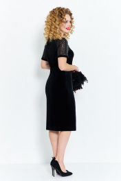 Платье женское выполнено из сочетания бархата и сетки с пайетками. Изделие полуприлегающего силуэта, прямого кроя. По полочке платья расположены нагрудные выточки, горловина округлая, рукав реглан короткий выполнен из отделочной ткани с пайетками, по низу рукава небольшая манжета из велюра. Спинка изделия разрезная . застежка- разрез от горловины с петлёй- пуговицей