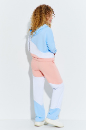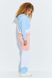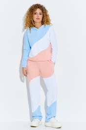 Костюм женский спортивный выполнен из трикотажного полотна, состоит из худи и брюк. Худи свободного кроя, средней длины(до середины бедра). Полочка и спинка худи разрезные. Горловина обработана - капюшоном. Рукав втачной длинный с манжетой по низу. Брюки Карго прямые от бедра, с завышенной посадкой на притачном поясе с резинкой. В боковых швах брюк имеются функциональные карманы.