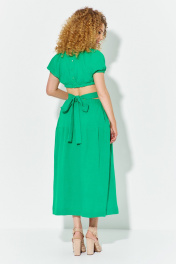 Платье женское из муслина с открытой талией. Изделие полуприлегающего кроя с А-образной юбкой. Лиф изделия с небольшой сборкой по горловине без выточек, горловина-округлая, рукав-реглан короткий с эластичной тесьмой по низу, по спинке лифа расположена застежка( планка с кнопками). Талия открытая с резинкой по переду и длинными завязками. Юбка миди с отрезным воланом и скрытыми карманами в боковых швах.
