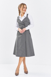 Сарафан женский выполнен из плательной ткани, изделие приталенного кроя, отрезное по линии талии. Сарафан на широких бретелях, по лифу изделия расположены отложные лацканы. Юбка трапециобразная , в боковых швах расположены карманы с клапаном. Сарафан двубортный с застежкой кнопки, в комплектации пояс из ткани основного изделия.