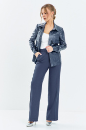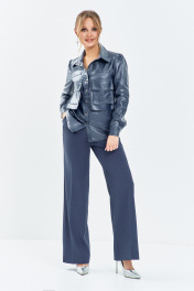 - ОписаниеКостюм 2х предметный, состоит из рубашки и брюк. Выполнен из сочетания льна с напылением и костюмной ткани. Рубашка из льна прямого кроя без подкладки, по полочке расположены накладные декоративные элементы и карманы с клапаном. спинка с отрезной кокеткой и таллиевыми выточками. Воротник отложной на стойке, рукав втачной 7/8. Брюки из костюмной ткани прямого кроя, завышенной посадки, на притачном поясе , в боковых швах расположены карманы, застёжка молния на гульфике.