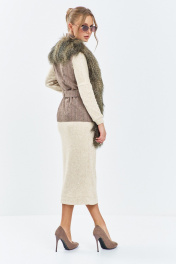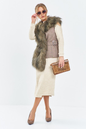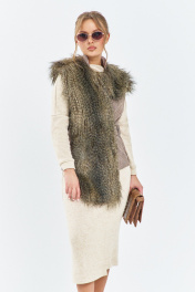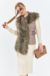 - ОписаниеЖилет женский выполнен из сочетания тканей: искусственного меха и джинса, жилет асимметричного кроя. Горловина округлая с небольшим воротником- стойкой. На полочке из денима расположена выточка и пояс с регулировкой объема талии.