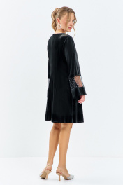 Платье коктейльное вечернее свободного силуэта, прямого кроя выполнено из велюра, горловина округлая, рукав втачной длинный, на рукаве внизу расположена декоративная вставка из сетки со стразами. На спинке платья расположены таллиевые выточки и потайная молния в центральном шве