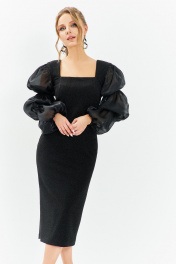 Вечернее платье выполнено из ткани с люрексной нитью в сочетании с органзой. Изделие прилегающего силуэта зауженное к низу. Вырез горловины низкий квадратный. Платье на широких фигурных лямках, рукав втачной длинный, с эластичной тесьмой. По спинке изделия расположены таллиевые вытачки и средний шов застежка потайная молния