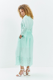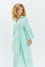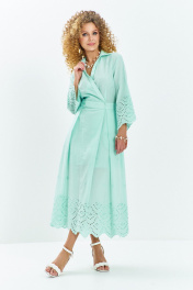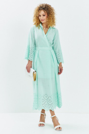 Платье-халат на запах с элегантным V-образным вырезом и отложным воротником. Крой «на запах» — самый комплиментарный для женской фигуры: он визуально сужает талию, вытягивает шею и подчеркивает линию декольте. Главное украшение модели — сложная вышивка с перфорацией (ришелье) по низу изделия и на рукавах. Ажурный узор с фестончатым краем придает платью премиальный вид и легкость. Свободные рукава длиной 3/4 с широкими ажурными краем.Легкая, дышащая ткань, хлопок 100% обеспечивает комфорт даже в самый жаркий день. Прекрасно подходит как для торжественных мероприятий на свежем воздухе, так и для отпускных прогулок или стильных городских будней.