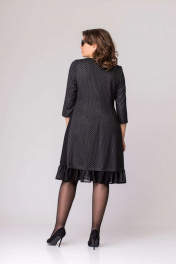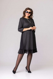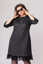 Платье женское нарядно-повседневное полуприлегающего силуэта слегка расширенное к низу, выполнено из трикотажного полотна в сочетании с шифоном. Вырез горловины "лодочкой" обработан обтачкой, рукав втачной 3/4. По низу платья волан из шифона, по спинке потайная молния. Декором служит вставки из шифона по боковым швам платья.