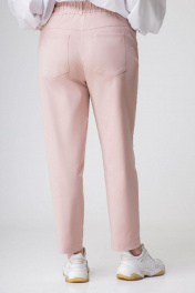 Блузка свободного силуэта выполнена из хлопковой ткани сочетание с трикотажным полотном, вырез горловины округлый обработан мягкой обтачкой с довязом, плечо спущенное, рукав втачной со сборкой по пройме и по низу на трикотажной манжете из довяза. По спинке кокетка с центральной складкой внизу собрана на кулису с фиксаторами регулирующими ширину по желанию, декором служит две небольшие печати по полочке и спинке Брюки женские на притачном поясе, джогеры зауженные к низу, выполнены из хлопкового джинса. Пояс на широкой резинке со шнуром и наконечниками, по центру передних половинок имитация застёжки и карманы, по задним половинкам кокетка и накладные карманы