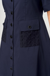 Платье женское красивое элегантное модное нарядное повседневное полуприлегающего силуэта выполнено из хорошего хлопка в сочетании с шитьем. Вырез горловины V-образный, застежка доверху на обметанные петли и пуговицы. Рукав втачно по центру со встречной складкой и притачной манжетой, что создает стильного образа. По полочке два функциональных накладных кармана, в боковых швах обработаны разрезы, что является трендом сезона. Декором платья служат отделочные элементы из шитья.