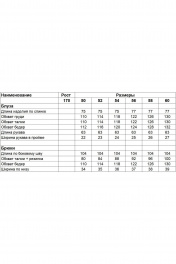 Костюм женский нарядный состоящий из блузы и брюк. Блуза женская нарядная выполнена из блузочной ткани с анималистическим принтом. Вырез горловины воротник на стойке рубашечного типа, застежка доверху на петли и пуговицы, плечо спущенное, рукав втачной по низу со складками на притачной манжете. По спинке двойная кокетка, в боковых швах обработаны разрезы, низ фигурный. Декором блузы служит дизайн самой ткани, декоративные пуговицы со стразами. Брюки прямые на притачном поясе выполнены из брючной ткани с люрексом. Пояс по всей длине на резинке, в боковх швах обработаны разманы. Декором служит дизайн ткани.