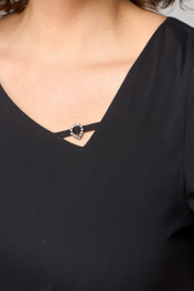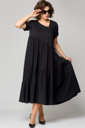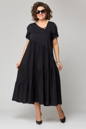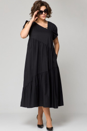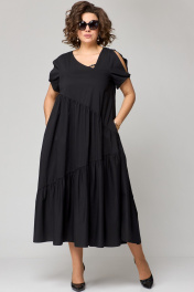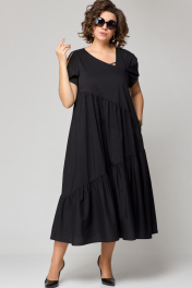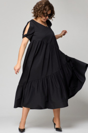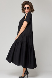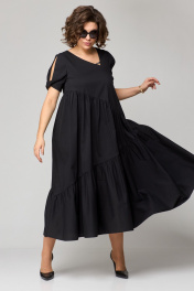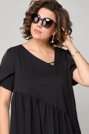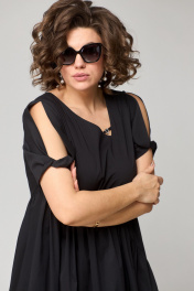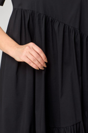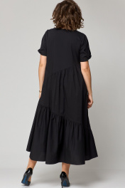 Платье женское наряно-повседненое свободного силуэта. Выполнено из хлопка. Вырез горловины фигурный, обрабоан отчкой и приутствует декоративный элемент не съемный, рукав втачной короткий с перекрутом по низу. По плочке и спинке платя ассиметричне подрезы со сборкой. В боковых швах обработаны карманы. По спинке платье чуть длинее чем по полочке. Декором платья служит элемент по фигурном вырезу горловины.