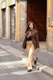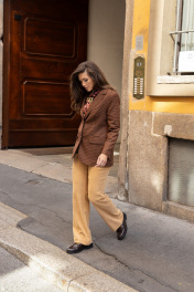 Брюки из осенне-зимней коллекции, виртуозно справляются с многозадачностью. Сдержанный бежевый оттенок и классический вневременной крой делают модель удачной основой и для нестрогого офисного образа, и для коктейльного наряда. Мастера бренда сшили вещь из мягкого вельвета. Фактурные полоски выстраивают вертикаль, визуально удлиняющую силуэт. Спереди и на заднем полотнище имеются карманы.
