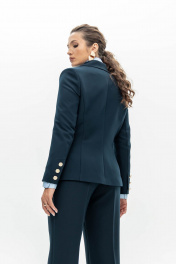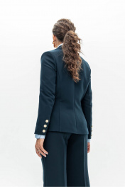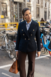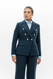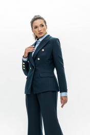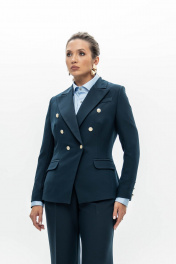 Темно-синий двубортный блезер с яркими золотыми пуговицами выстраивает безупречный четкий силуэт. Внутренние плотные вставки формируют строгую линию плеч, а правильно расставленные вытачки очерчивают талию. В меру плотная эластичная поливискоза делает крой выразительным и одновременно позволяет модели не стеснять движения. Четкое попадание в стиль и роскошь.