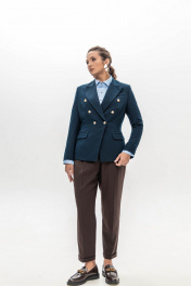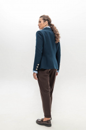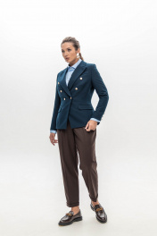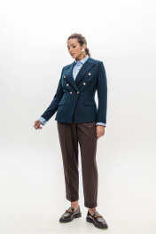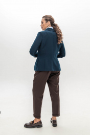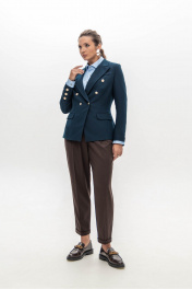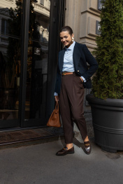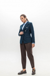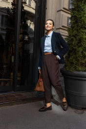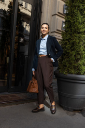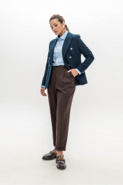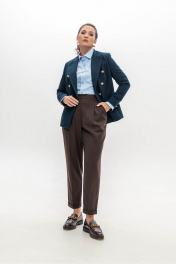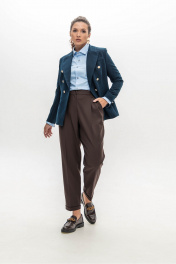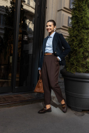 Брюки шоколадного цвета мастера марки выполнили из плотного, но при этом мягкого поливискозного трикотажа. Материал немного тянется, не стесняя движения, а две складки у высокого пояса создает удобную посадку. Модель со стрелками отлично вытягивает силуэт. Спереди и на заднем полотнище брюк имеются карманы.
