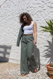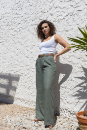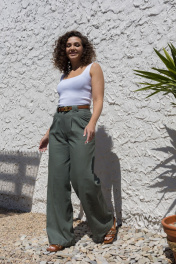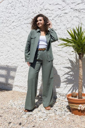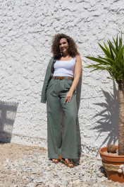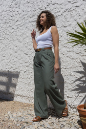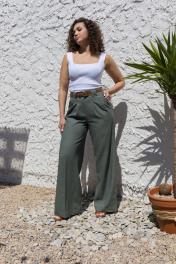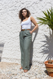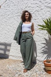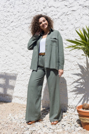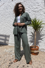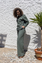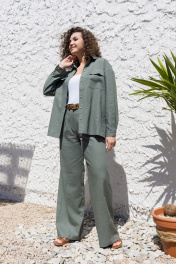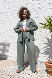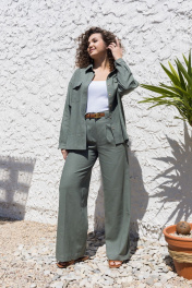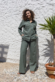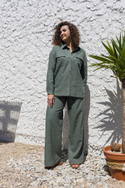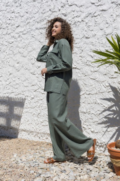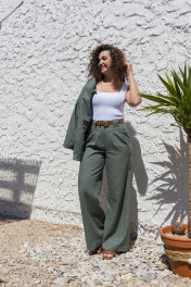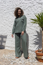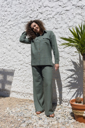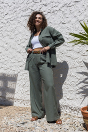 Стильный Костюм женский изо льна в размере оверсайз. Выполнен из высококачественного льна в цвете хаки, сплетённый нитями веков. Лен выращенный в Беларуси без искусственного полива, без использования семян ГМО и дефолиантов. Костюм состоит из элегантных брюк, где имеется пояс с отрезными шлёвками, мягкие складки отлично скроют недостатки фигуры, сделают силуэт стройным и вытянутым. Льняная рубашка оверсайз кроя с накладными карманами обеспечит свободу и удобство в носке, а пуговицы из кокоса дополняют образ особым стильным дизайном. Это отличный выбор для офисной моды в сочетании с элегантными босоножками на каблуке, для отдыха на море со шлепками, а так же идеально подходит для вечерней моды с аксессуарами из золота в сочетании с маленькой сумочкой-клатчем. Рубашку и брюки можно носить отдельно друг от друга, создавая огромное количество дневных и вечерних образов. Элегантный льняной костюм выполнен в классическом стиле, подойдёт на любую фигуру, сделает вас привлекательной и уверенной в себе.