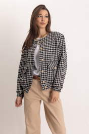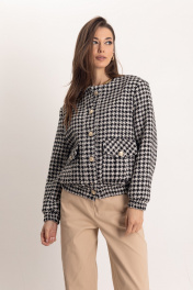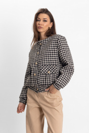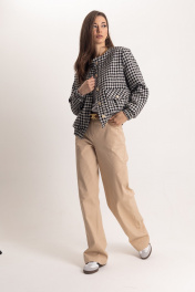 Комплект: бомбер и прямые брюки - хорошее дополнение к межсезонному гардеробу. Фактурная ткань из вискозы с добавлением полиэстера, отлично держит форму. У модели черно-молочная расцветка с узором гусиной лапки, карманы с клапанами и спущенная линия плеча. Бомбер идеально сочетается с джинсами из хлопка. прямого кроя, что обеспечивает свободу движений и комфорт в повседневной жизни. Песочно-бежевый цвет добавляет стиль и универсальности, позволяя легко сочетать эти джинсы с монохромным цветом бомбера. Модель брюк имеет четыре кармана, что делает их функциональными и практичными. Комплект идеальный выбор для делового или повседневного аутфита.