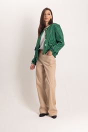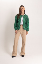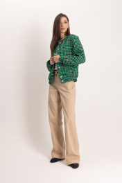 Комплект: бомбер и прямые брюки - хорошее дополнение к межсезонному гардеробу. Фактурная ткань из вискозы с добавлением полиэстера, отлично держит форму. У модели черно-зеленая расцветка с узором гусиной лапки, карманы с клапанами и спущенная линия плеча. Бомбер идеально сочетается с джинсами из хлопка. прямого кроя, что обеспечивает свободу движений и комфорт в повседневной жизни. Песочно-бежевый цвет добавляет стиль и универсальности, позволяя легко сочетать эти джинсы с монохромным цветом бомбера. Модель брюк имеет четыре кармана, что делает их функциональными и практичными. Комплект идеальный выбор для делового или повседневного аутфита.