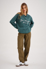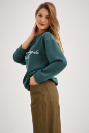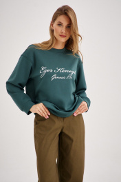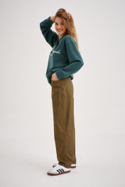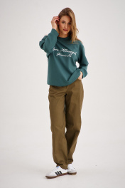 Универсальный комплект из свитшота и прямых джинсов. Толстовка из плотной трикотажной ткани, без застежек и карманов, свободного покроя. Трендовый глубокий зелёный цвет и надпись классического стиля делают данный свитшот стильным элементом гардероба в стиле "Old money". Прямые джинсы выполнены из 95% натурального хлопка, что обеспечивает комфорт и приятное ощущение при ношении. Модель имеет четыре кармана, что делает их функциональными и практичными. Благодаря своему классическому дизайну, они являются универсальной вещью в гардеробе. Свитшот глубокого зелёного цвета в сочетании с джинсами-брюками цвета хаки идеально создает как повседневный, так и вечерний образ.