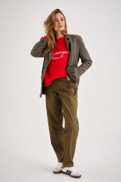 Универсальный комплект из жакета, свитшота и джинсов бананов идеально создает как повседневный, так и вечерний образ. Элегантный однобортный приталенный клетчатый жакет в английском стиле "Old money" на основе не мнущейся поливискозы с карманами-клапанами. Толстовка выполнена из плотной трикотажной ткани, без застежек и карманов, свободного покроя. Трендовый алый цвет и надпись классического стиля делают данный свитшот стильным элементом гардероба. Практичные и стильные джинсы бананы, имеют высокую посадку, тем самым подчеркивая талию и скрывают недостатки в области живота. Брюки выполнены из 95% натурального хлопка, что обеспечивает комфорт и приятное ощущение при ношении. Свободный крой по всему объему бедер, слегка зауженные книзу брючины. Длину брюк можно подвернуть и скорректировать по своему усмотрению