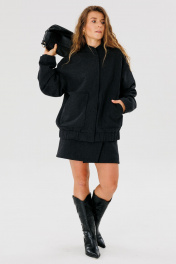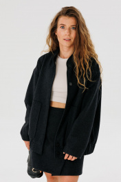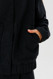 Стильный тёплый бомбер прямого кроя, среднего объёма, карманы накладные с косым входом, застежка - центральная на пришевные кнопки. Ткань - шерстяная смесовая, пальтовая. Длина изделия 68 см