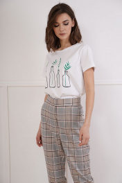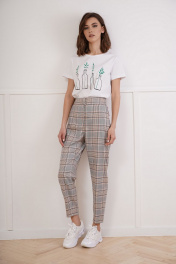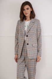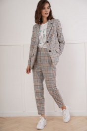 Одним из самых практичных предметов гардероба является костюм-двойка. Такая модель хороша тем, что её можно носить не только в комплекте, но и комбинировать отдельные элементы с другими предметами гардероба, создавая множество интересных ансамблей. Классический пиджак свободного покроя с английским воротником, однобортной застежкой и прорезными карманами с клапанами. Рукав двухшовный с широкой отложной манжетой. Брюки укороченные, с высокой посадкой, отрезным поясом на переде и поясом с эластичной тесьмой на спинке. По передним половинкам боковые карманы. Застежка на потайные крючки и молнию. Длина брюк около 98 см. Длина жакета около 70 см. Длина рукава около 61 см.