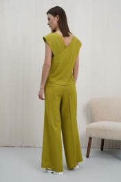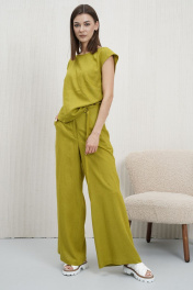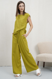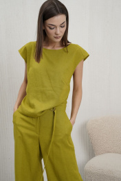 Один из самых удобных и практичных материалов в летнее время - лён. Женские костюмы из льна можно смело назвать одеждой универсальной - они имеют отличную воздухопроницаемость, прочность, одновременно позволяют каждой девушке выглядеть безупречно. Стильный комплект состоит из блузы-топа и брюк. Брюки длинные, широкие идеально подойдут для создания лаконичных офисных луков, блуза - с оригинальным решением спинки в виде запаха из двух перекрещивающихся широких полос. Брюки на притачном поясе, фиксируются асимметричным узким пояском на пате с полукольцами в левой части переда. В поясе сзади - эластичная широкая тесьма для лучшей посадки на любой талии. Карманы наклонные боковые. Блуза свободная без рукавов с круглым вырезом горловины по переду и V-образным по спинке. Наклонная нагрудная вытачка на переде обеспечивает отличную посадку на фигуре. Длина блузы по спинке около 52 см. Длина брюк по боковому шву около 104 см.
