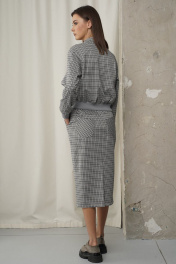 Женские костюмы уже давно стали ответом на вопросы стиля. Костюм - это уже готовый завершенный образ. Один из модных трендов сезона - сочетание юбки длинны миди и укороченного жакета. Модная расцветка, свободный покрой с заниженной линией плеча, воротник - стойка, переходящая в фигурную линию борта. Застежка - двубортная на пуговицы и потайные магниты. По низу жакета и рукавов - трикотажный эластичный довяз. Юбка прямая, на передних половинках боковые наклонные карманы. На задних половинках кокетки и накладные карманы в направлении под углом 45 градусов и высокая шлица. Длина жакета около 52 см. Длина рукава с плечом около 73 см. Длина юбки около 68 см