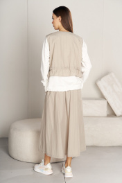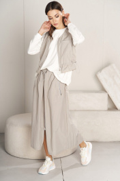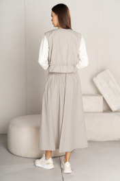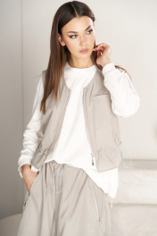 Мода всегда приветствует новые и свежие решения. Поэтому комплекты необычного кроя становятся всё более популярными. Здесь нет ограничения на фантазии: акцент на нетрадиционную яркую ткань, интересный покрой, фурнитуру. Жилет свободный с центральной застёжкой на тесьму-молнию, кулисой чуть ниже линии талии, неширокой баской. Полочки с отрезной кокеткой и прорезным карманом с листочкой. Кулиса с эластичным шнуром и фиксаторами. Юбка коническая, на притачном эластичном поясе с дополнительным шнуром-резинкой и фиксатором. По переднему полотнищу - застёжка-молния и боковые карманы с отделочными молниями.