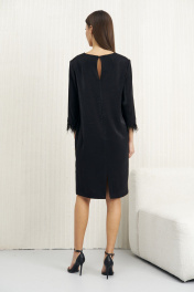 Элегантное платье прекрасно подчеркнёт Ваш стиль и красоту. Лаконичный дизайн и упрямлённый силуэт и круглый вырез горловины – особый шарм данной модели. Платье выполнено из полотна отличного качества. Главная изюминка данной модели – лента из натуральных страусиных перьев по рукавам, которую при желании легко можно отстегнуть. Длина рукава ок. 50 см. Длина платья по спинке ок.94 см.